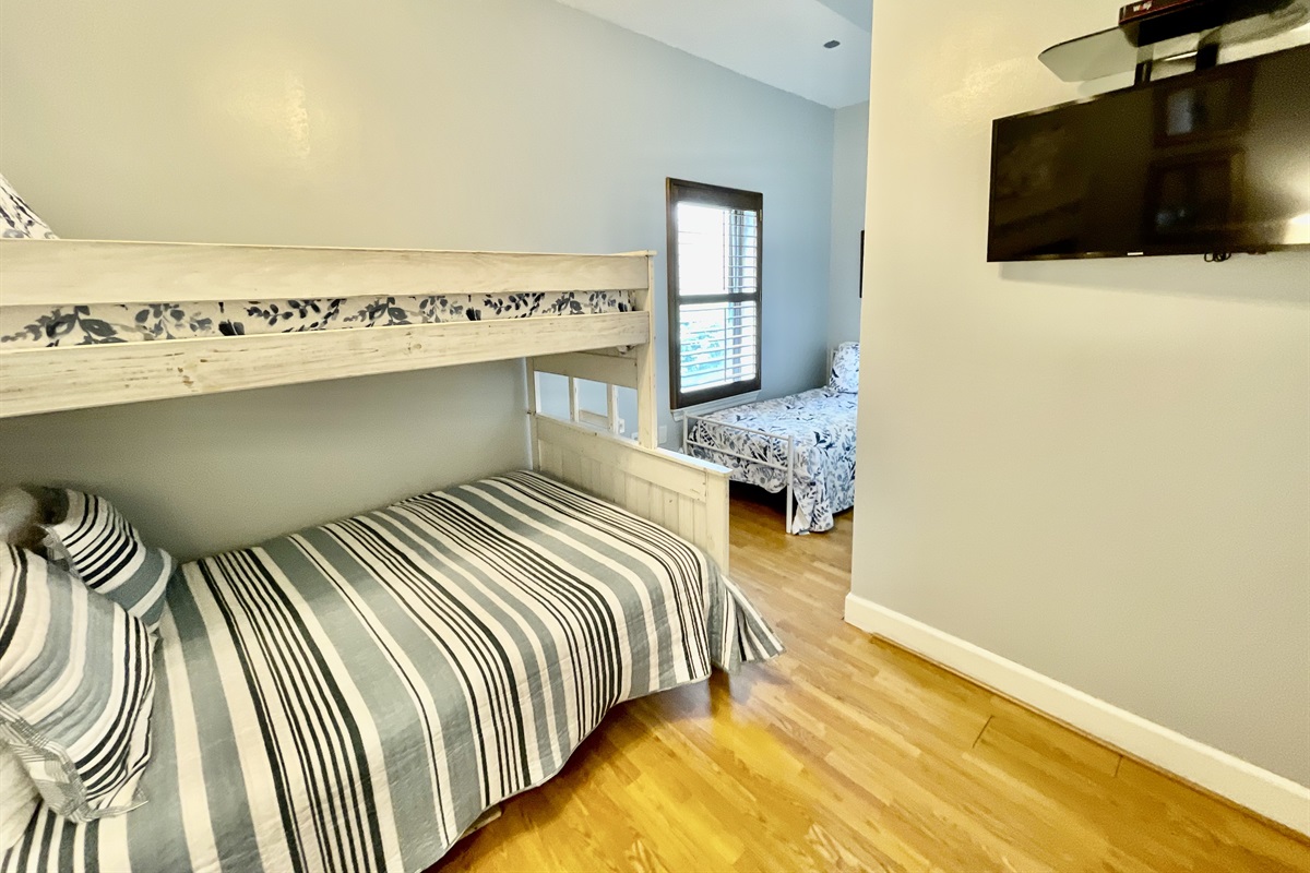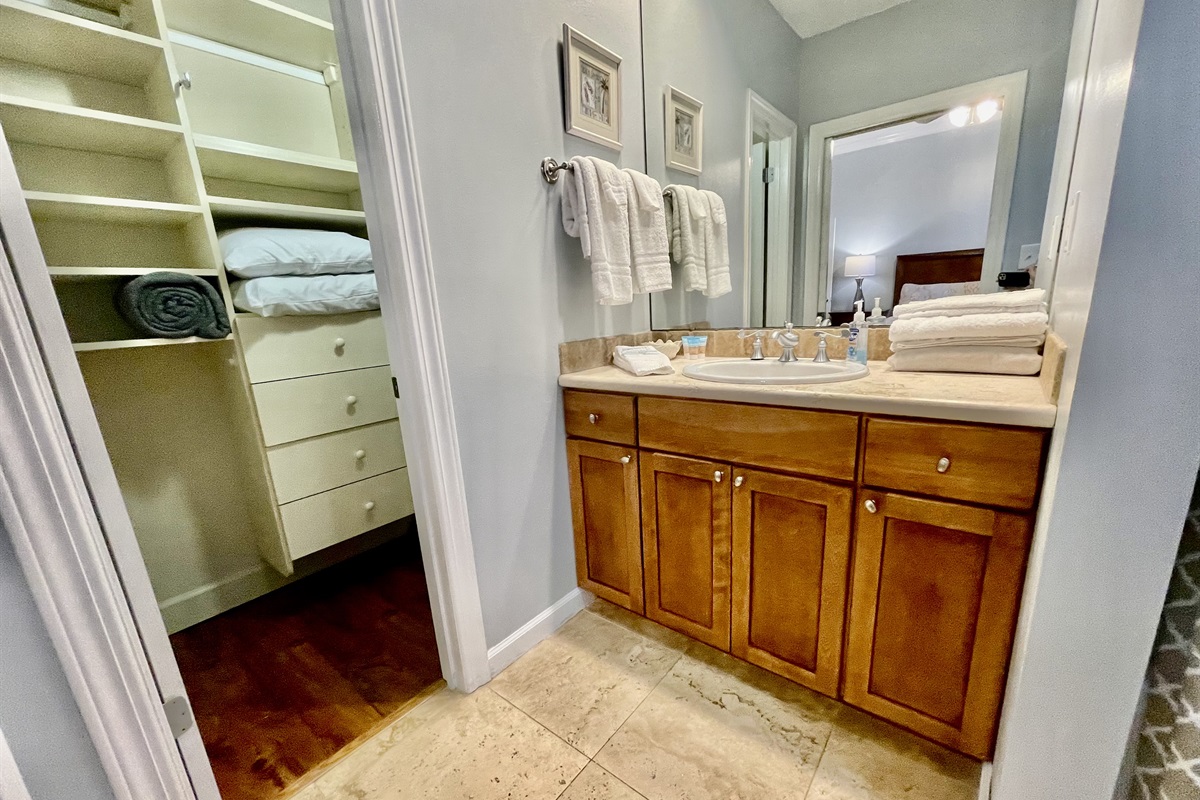 The Master Bedroom has a king-sized bed with an adjoining bath with a soaking tub, walk-in closet and Travertine floors. The kids will love the guest room with a full/twin bunk bed and an additional twin bed! The guest bathroom is down the hall, near the guest bedroom. There is a washer and dryer in the unit as well for you to use during your vacation!